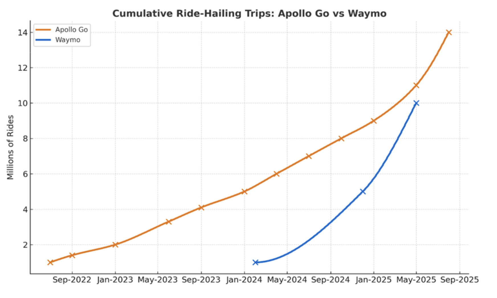 Chinese autonomous mobility companies have also made strong progress, led by Baidu’s Apollo Go, often described as the Waymo of China. As of May 2025, Apollo Go had completed 11 million cumulative ride-hailing trips, slightly ahead of Waymo’s 10 million at the same time (Figure C). In Q2 2025 alone it delivered 2.2 million rides, representing 148% year-on-year growth. Since February 2025, Apollo Go has been operating fully driverless across China with no safety drivers and now serves 16 cities globally.