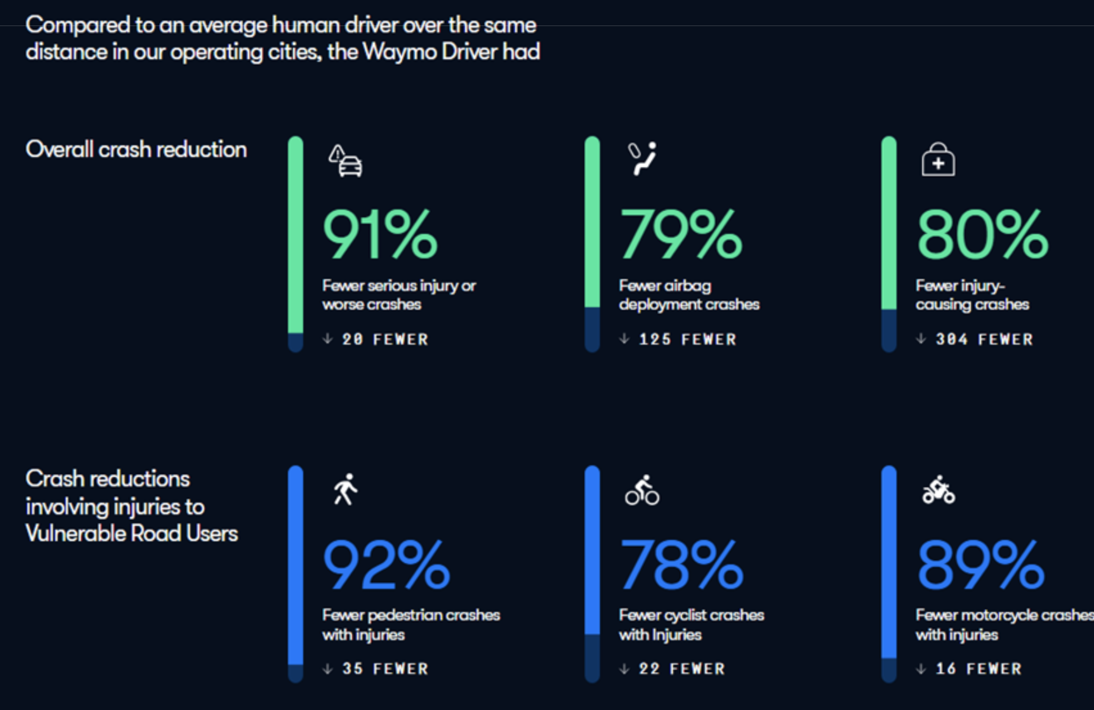 Waymo’s approach offers strong redundancy and precise localisation, which underpins proven commercial deployments. Waymo has also published data showing its vehicles are safer than the average human driver across several key metrics in the areas where it operates, with ‘91% fewer serious injury or worse crashes’ (Figure D). According to a TIME article in June 2025, Waymo’s Director of Field Safety, Matthew Schwall, believes the company’s autonomous vehicles are technically capable of operating safely in any American town, but widespread rollout depends on building local infrastructure and public trust.