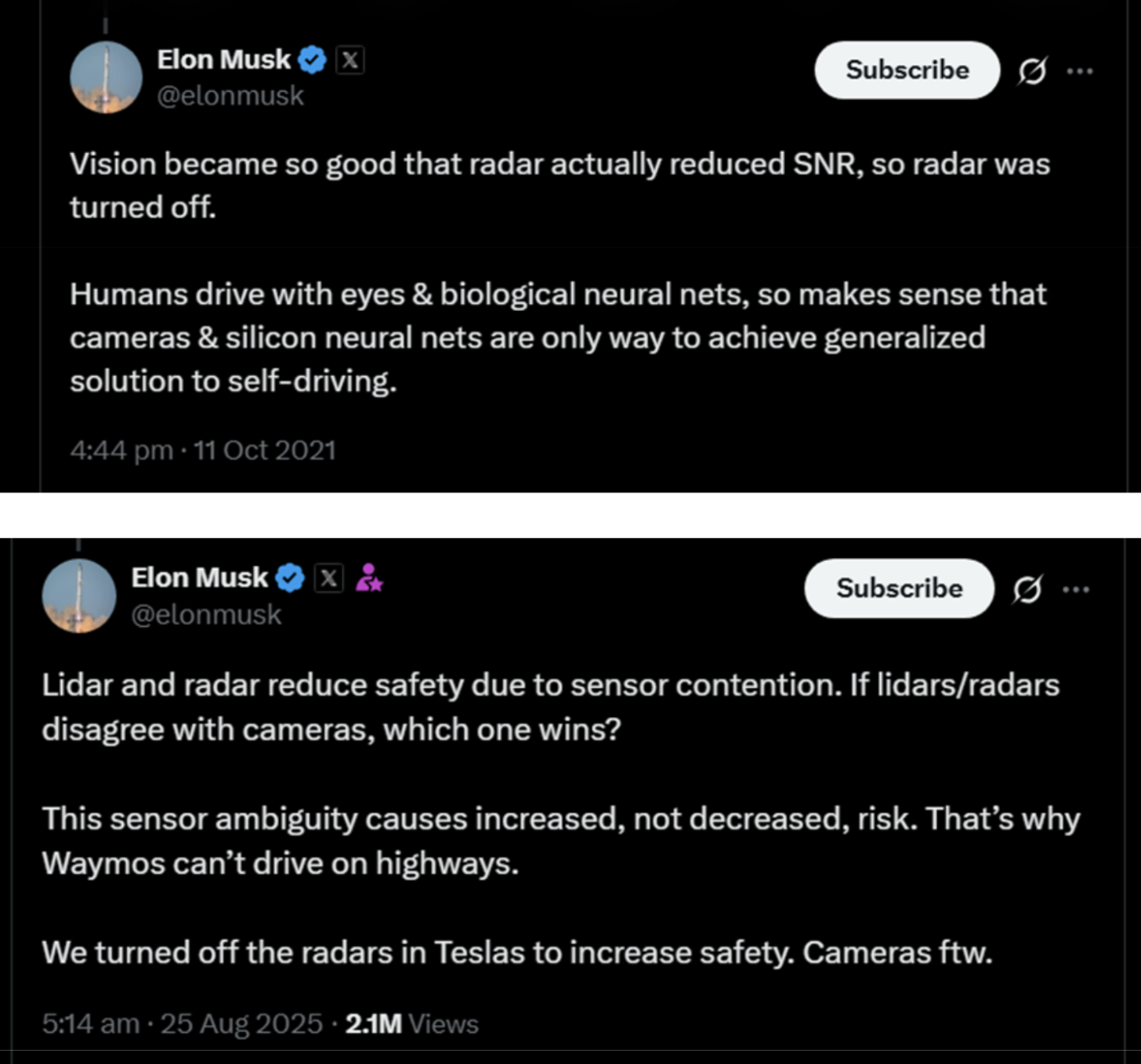 Many, however, question whether a camera-only system can meet the safety threshold for driverless operations. Musk argues that a multi-sensor approach increases complexity, potentially reducing signal-to-noise ratio (Figure E). Tesla’s “photons to control” approach utilises raw camera feeds, with their high dynamic range providing rich visual information, for both model training and inference at run-time.