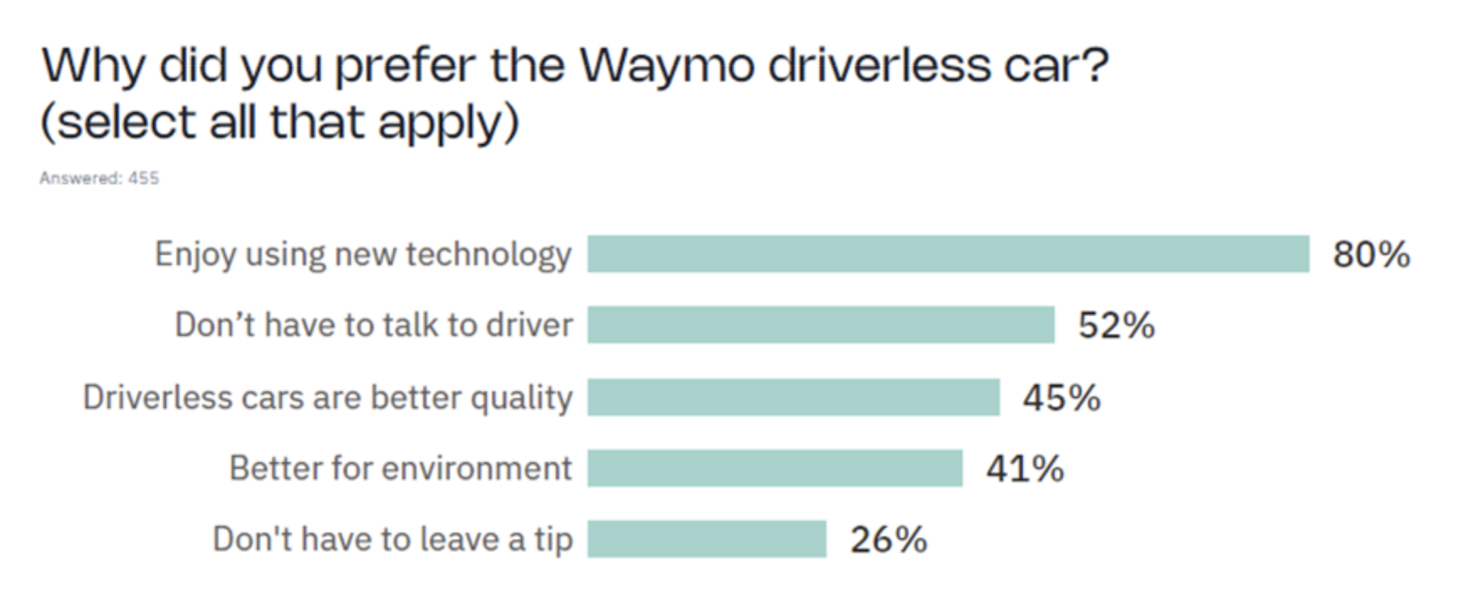When respondents were asked why they preferred the Waymo, 52% of respondents said it was because they did not need to speak to the driver (Figure H). It is also likely that some riders feel safer without a human driver, though that was not an option on the questionnaire. We assume these factors can to some extent explain its growing market share and its ability to command a premium.