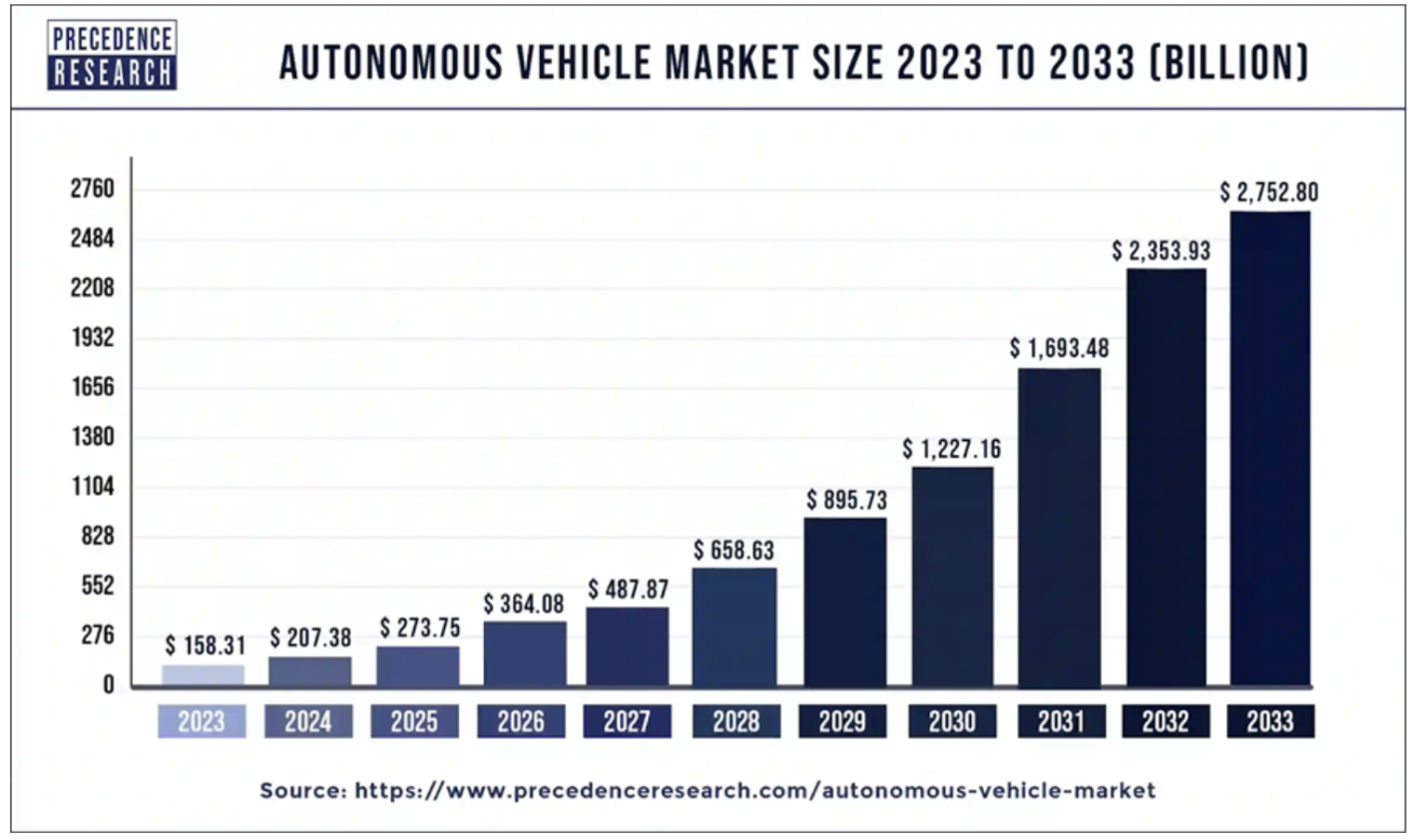 Since autonomous technologies are still in the very early stages of their rollout, the estimates for total addressable market (TAM) vary significantly across forecasts. For instance, according to Fortune Business Insights, the global autonomous vehicle market was valued at just over US$1.9 trillion in 2023 and is expected to grow to US$13.6 trillion by 2030 (representing a CAGR of 32.3%)! On the other end of the spectrum, Precedence Research has a relatively conservative estimate for the Autonomous Vehicle Market at US$158.3 billion in 2023, set to grow to US$2.75 trillion by 2033 (Figure I).