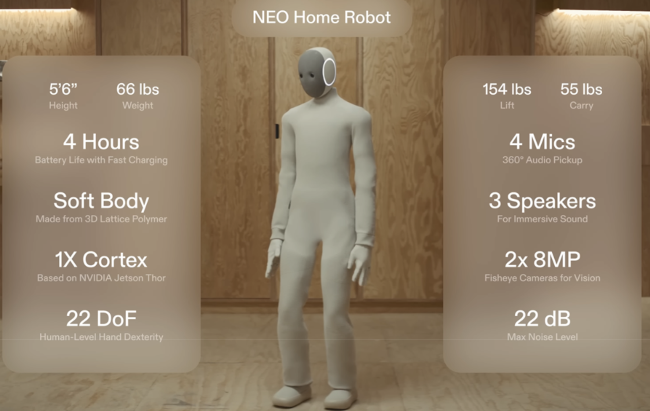 1X gained considerable attention in October 2025 when it announced early-access pre-orders for its home robot, Neo. This is a lightweight humanoid designed to help with chores and act as a companion, allowing users to ask questions such as where they last left their keys. US deliveries are set for 2026, with early access priced at US$20,000 or US$499 per month.