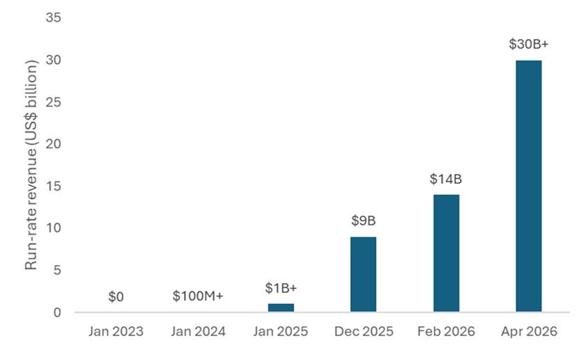 Anthropic was founded in early 2021 by a group of former OpenAI employees led by siblings Dario and Daniela Amodei. It initially operated largely out of the spotlight, but that changed as Claude gained significant traction. This was reflected in its rapid revenue growth, with its annualised run-rate increasing by roughly 10x in both 2024 and 2025 before surpassing US$30 billion by early April 2026 (Figure 2).