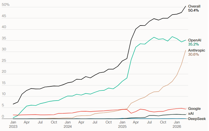 Anthropic’s brand has also been a key asset. We have come across many anecdotes of enterprises choosing Anthropic because it is seen as more reliable and trustworthy than its competitors. Additionally, Business Insider reported in early March 2026 that Claude saw an influx of users following Anthropic’s stance against the Pentagon’s proposed use of its models. Many of those new users were defectors from ChatGPT, as OpenAI had subsequently agreed to deploy its models for the Department of War.