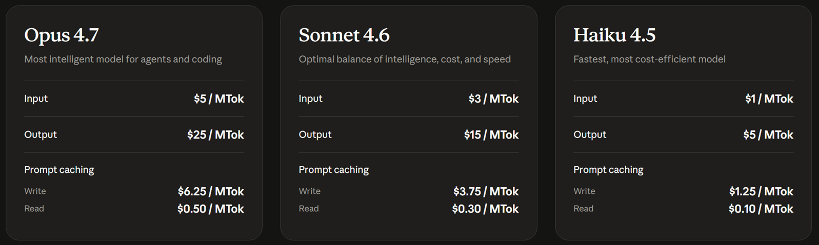The company also offers a tiered model lineup. Opus 4.7 is the most capable broadly available model and is positioned for the most complex coding and reasoning tasks (Figure 1). Sonnet 4.6 offers the best balance of speed and intelligence, while Haiku 4.5 is the fastest and most cost-efficient option for lighter or high-volume workloads.